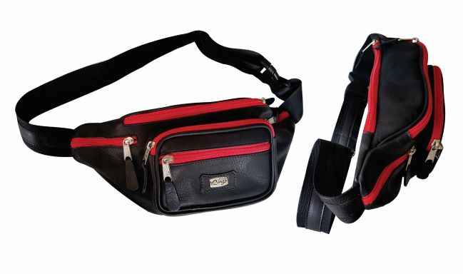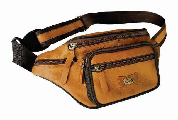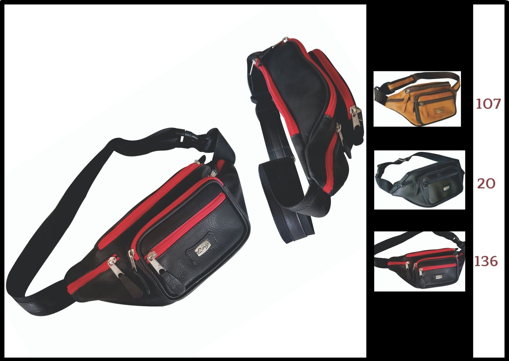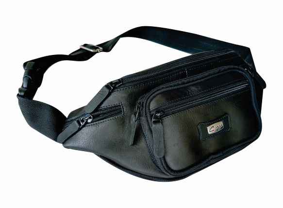 Belt bag, in leather, with reinforced strap, 6 services and exterior pocket with gusset.